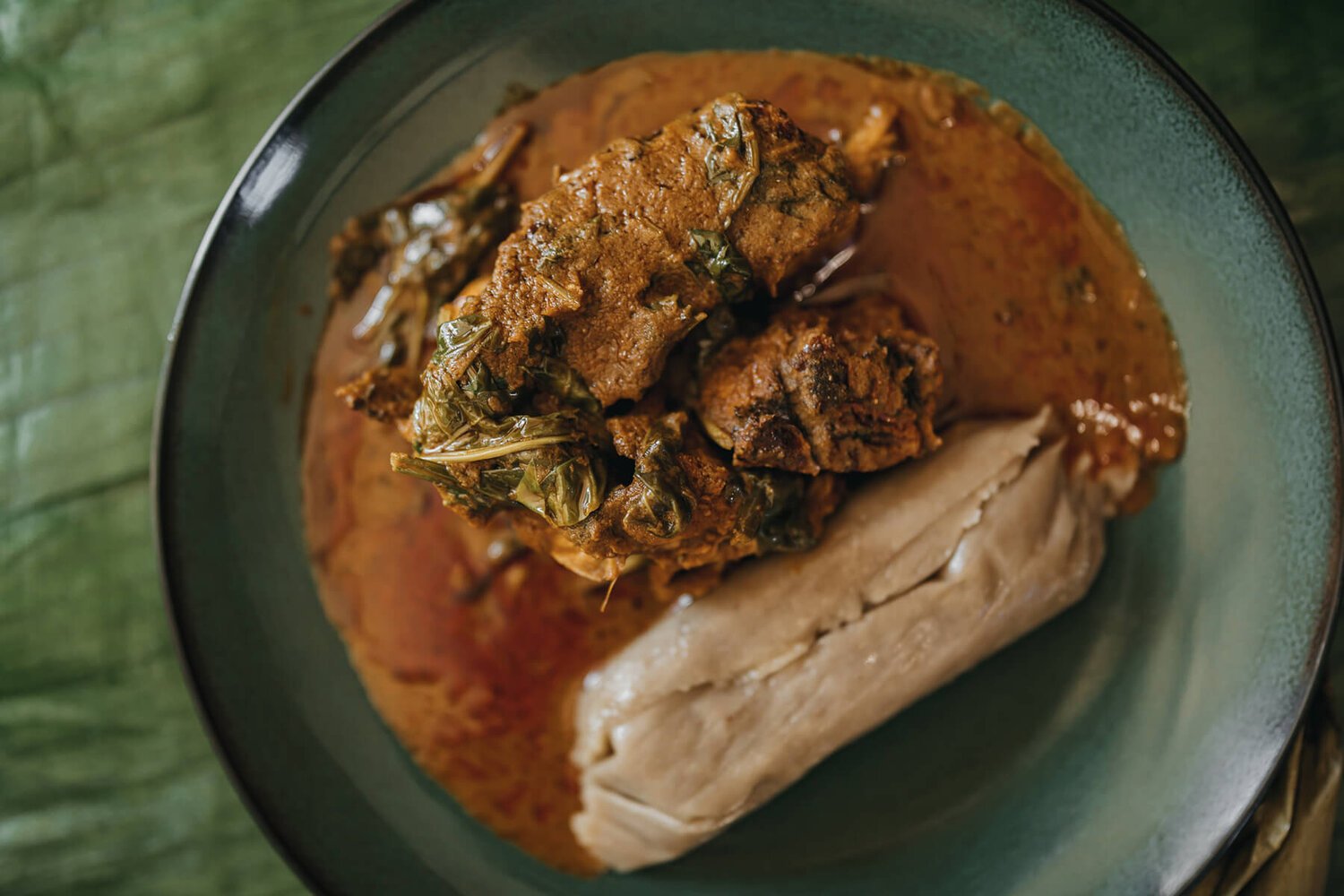 Grated cocoyam steamed in banana leaves (kwacoco), paired with a rich palm nut (mbanga) soup, usually served with fish or meat.
